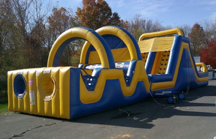 Get ready for non-stop fun with this thrilling 60-ft inflatable obstacle course designed for speed, excitement, and friendly competition! With its bold blue and yellow colors, this course is perfect for kids and adults alike, offering an adventure full of climbing, crawling, sliding, and bouncing fun! This 2-piece unit is a must have for any large event or gathering. Compete against each other or have timed races with different age groups. The is a two-piece obstacle course with the front being the obstacle feature and the rear being the slide.
