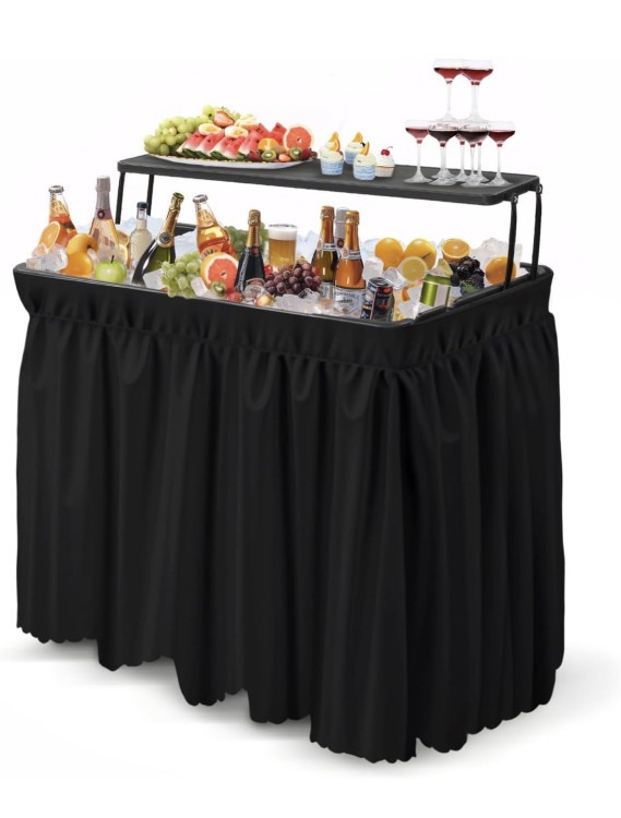 Add style and convenience to your event with our Fill & Chill Beverage Table with Bar Shelf. This elegant cooler table features a spacious built-in ice well to keep drinks perfectly chilled, along with a raised bar shelf for serving and display. Finished with a fitted table skirt for a clean, professional look, it’s ideal for weddings, cocktail hours, showers, corporate events, and backyard celebrations.